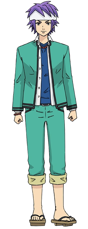 Reita is usually seen wearing a white headband on his head. He has violet, spiky, medium length hair that grows through his collar. Like Shun and Riki, while at PK Academy, he wears the uniform in a lax manner, showing his dark blue t-shirt, and rolls up his pant legs. Since he is the son of a monk, he wears Buddhist priest beads on his neck and his right wrist. During his days off, he sometimes wears samue when he is in the temple and sometimes wears a polo shirt with t-shirt under it.
